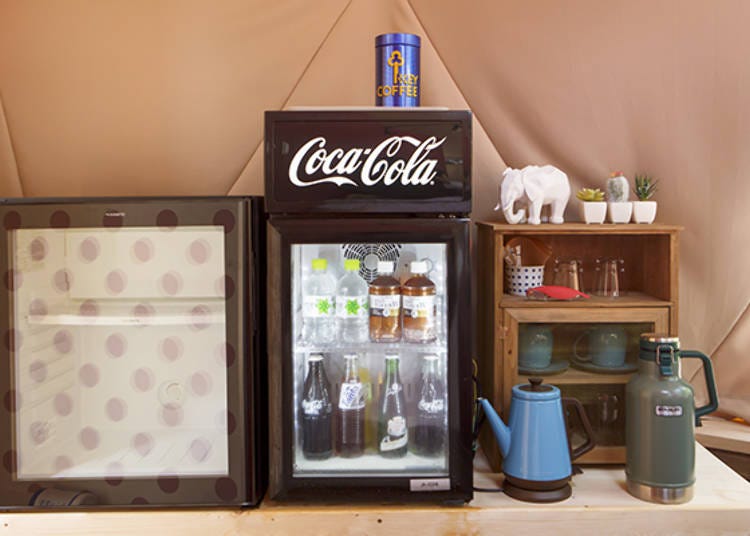 房間內的飲料完全免費,也可以自行攜帶,左為冰箱(攜帶保冷箱入內需另加收5,000日圓、未稅)。