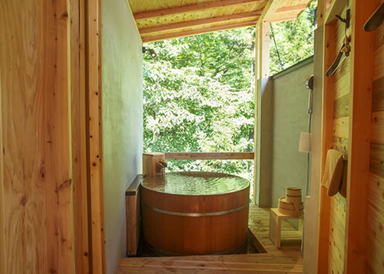 哇!檜木打造而成的露天浴池!木頭香氣撲鼻而來。