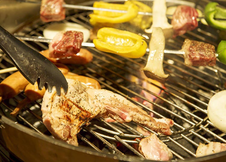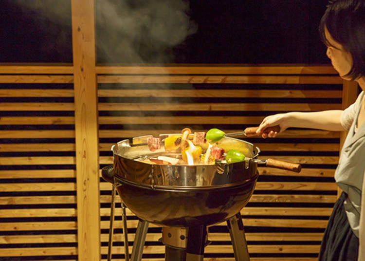 今天晚餐是「上州牛五花肉、群馬麥豬、蔬菜與上州牛里肌肉的BBQ串燒、當季蔬菜、豬肉香腸、帶骨肉腸(大・小)、現煮土鍋白飯、烤棉花糖」。