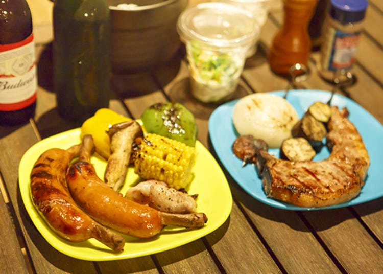 烤肉大會開始!我們這兩個不習慣露營的女人,用點火劑很順利就生好火,如果真的沒辦法也可以向櫃檯求救,工作人員會來幫你搞定一切的(笑)