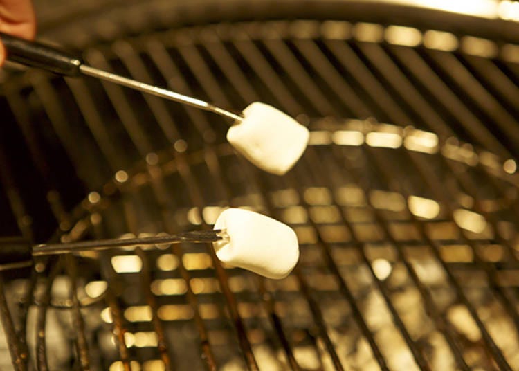 將棉花糖稍微用炭火烤一下,變軟後夾進餅乾裡,再淋上楓糖糖漿就完成啦!