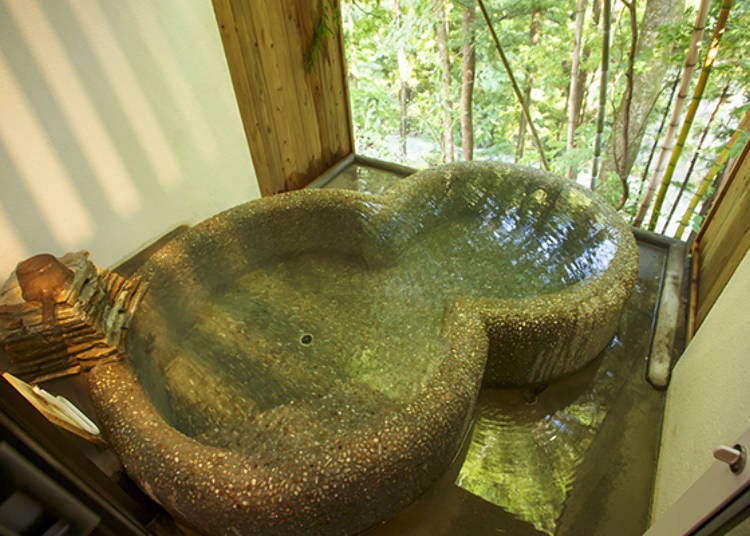 葫蘆型的露天浴池,雙腳可以完全伸直沒問題!