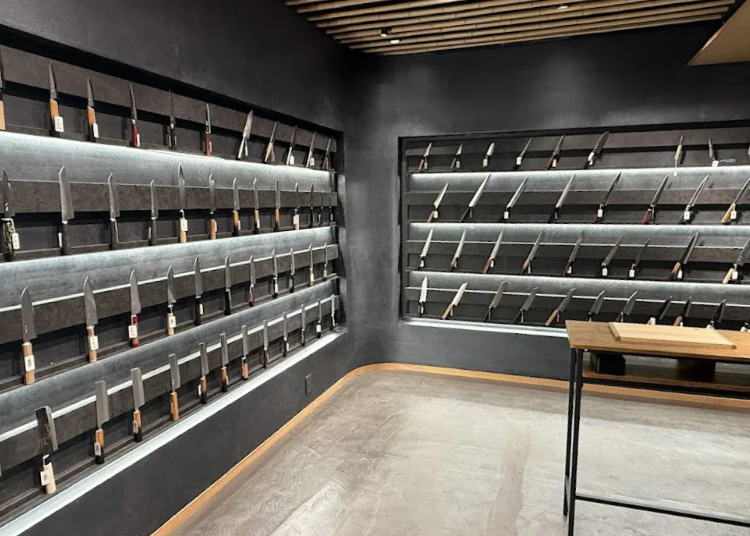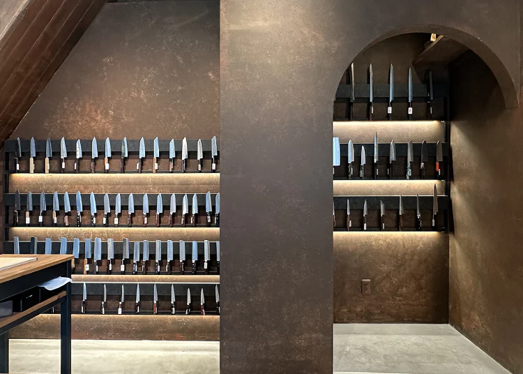 走進店內,映入眼簾的便是一整面壯觀且精美的菜刀牆。其中,擁有如流水般波紋的「大馬士革鋼」刀刃,每一把都擁有獨一無二的紋路,宛如真實的藝術傑作。