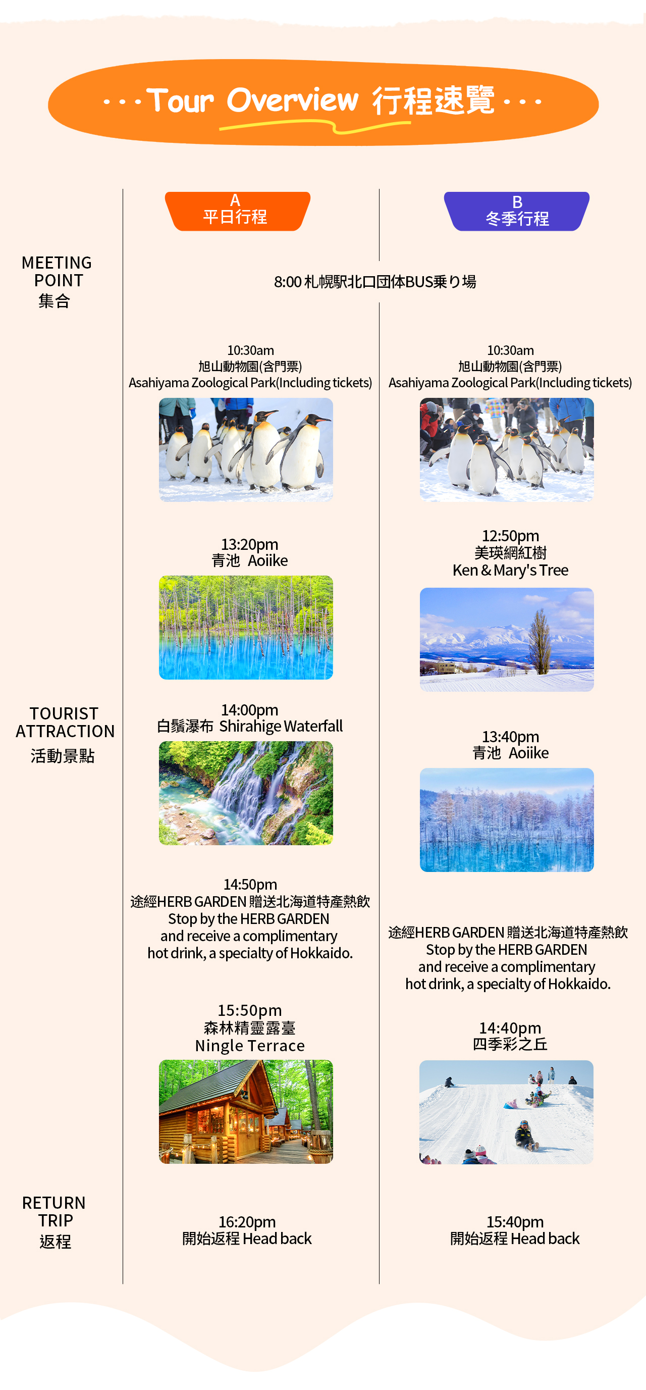 **各位貴賓大家好,以下為當天的參考行程說明** (請注意:導遊可能會根據當天的實際情況調整行程順序,或刪減部分景點的停留時間) **行前通知提醒** 出行前一晚,我們將通過郵件發送導遊與車輛的詳細資訊。有時郵件可能會被誤分類至垃圾箱,請務必檢查。如因特殊情況您收到多封郵件,請**以最後一封為準**。感謝您的理解! --- **【旭山動物園】** 位於北海道旭川市,是日本最北的動物園,也是冬季人氣極高的打卡地! 必看亮點: ・企鵝雪地散步 ・海豹穿梭透明水柱 ・小浣熊頭頂攀爬 不論是大人還是小孩,都會愛上這裡的可愛動物們! --- **【季節限定景點】請根據日期選擇體驗內容:** **12月1日~3月31日期間出發:** * 走進**旭山動物園**,近距離欣賞企鵝雪地散步、海豹穿梭與可愛動物互動; * 途經**美瑛網紅樹**,感受廣袤丘陵上的浪漫畫面; * 漫步在夢幻的**青池**,欣賞隨光影流轉而變幻的碧藍池水; * 最後來到**四季彩之丘**,在皚皚白雪覆蓋的山丘中盡情體驗雪上樂趣。 **4月1日~11月30日期間出發:** ・走進**旭山動物園**,近距離欣賞企鵝雪地散步、海豹穿梭與可愛動物互動; ・**美瑛青池**:神秘的夢幻藍水池,倒映出樹影與天空,適合靜靜欣賞。 ・**白鬚瀑布**:岩石縫隙中湧出的雪融水,形成潔白瀑布,近距離觀賞大自然奇觀。 ・**森林精靈露臺(11月3日,11月11日~11月28日期間),此景點時間會加在旭山動物園行程時間內(110分鐘增加至140分鐘)** 由作家倉本聰構思的小精靈手作村,走入寧靜童話世界。 --- **準備好相機與舒適衣物,一起開啟旭川與美瑛的冬季奇幻之旅**! 不論是呆萌的企鵝,還是晶瑩的雪原,都會為您留下難忘回憶!