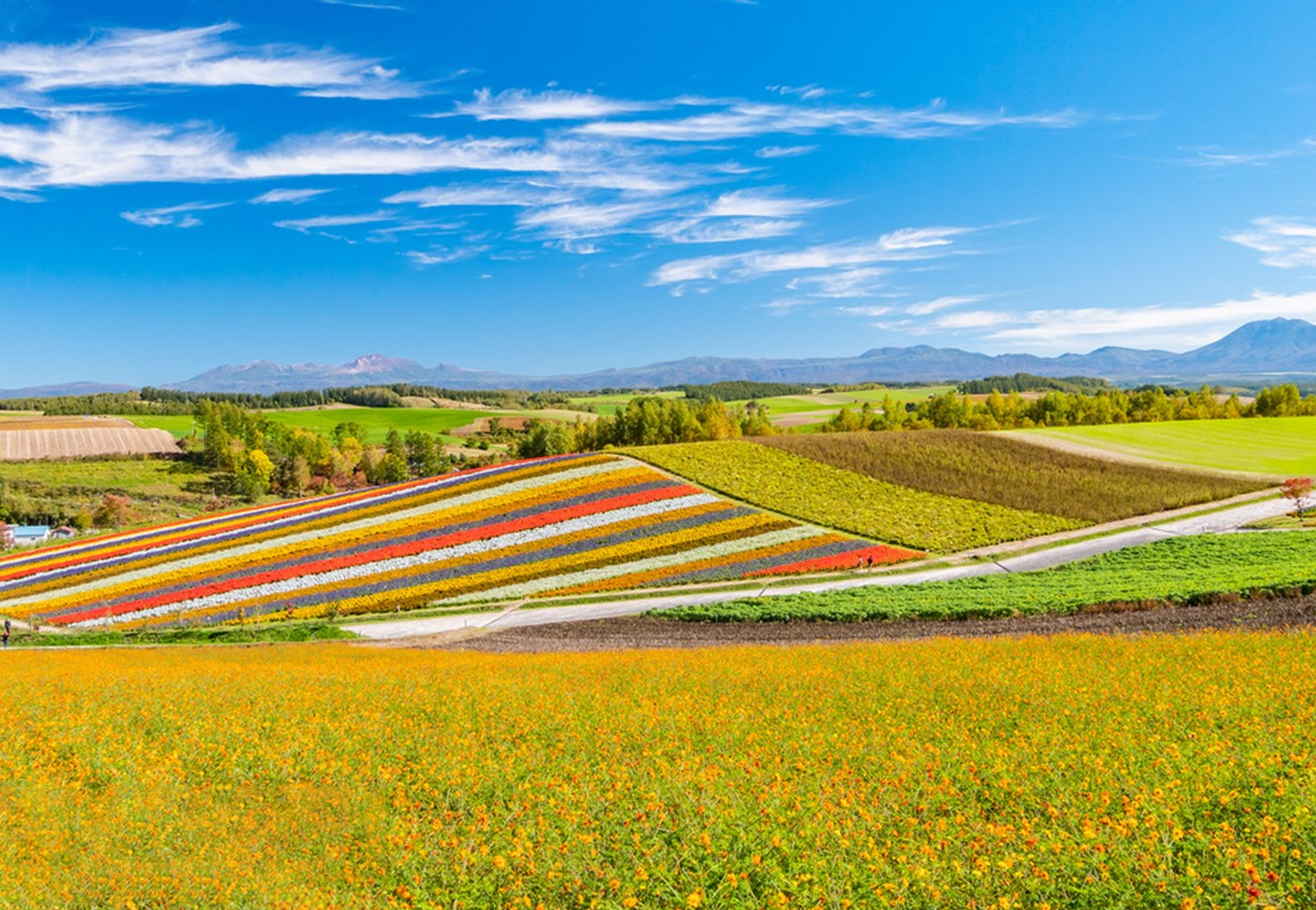 - 5 月末至 10 月末,鬱金香、薰衣草、向日葵等 30 餘種花卉次第綻放,起伏丘陵化作畫家打翻的調色盤,田間巨型稻草人可愛又治癒,一眼淪陷。