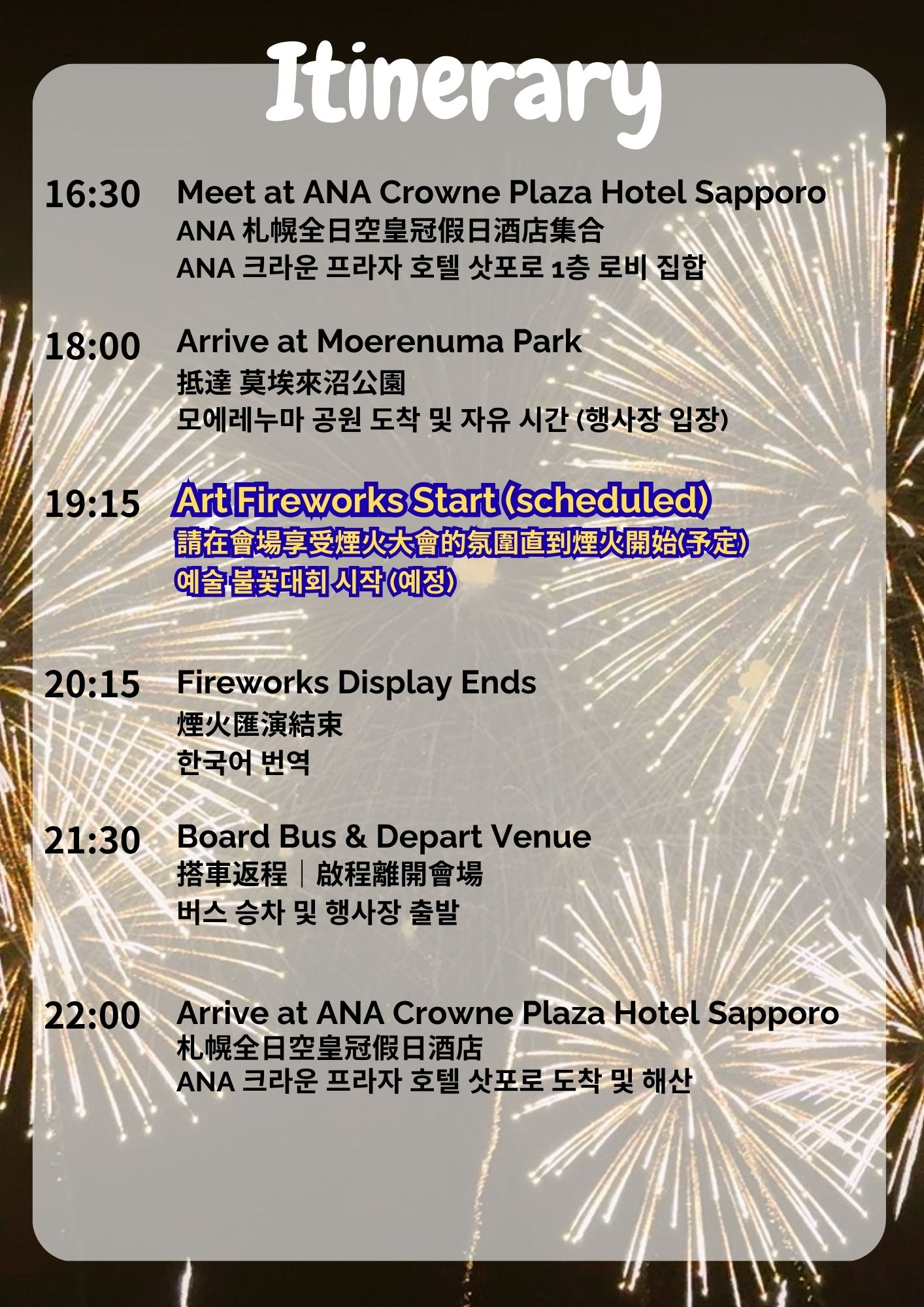 # 藝術煙火 藝術煙火是北海道札幌市舉辦的一項夏季盛事。這場特別的煙火表演由曾榮獲日本首相獎的煙火技師設計。 煙火表演的製作與場地位置和地區特色相協調,以提升整體效果,並運用先進技術將傳統煙火轉化為藝術品。