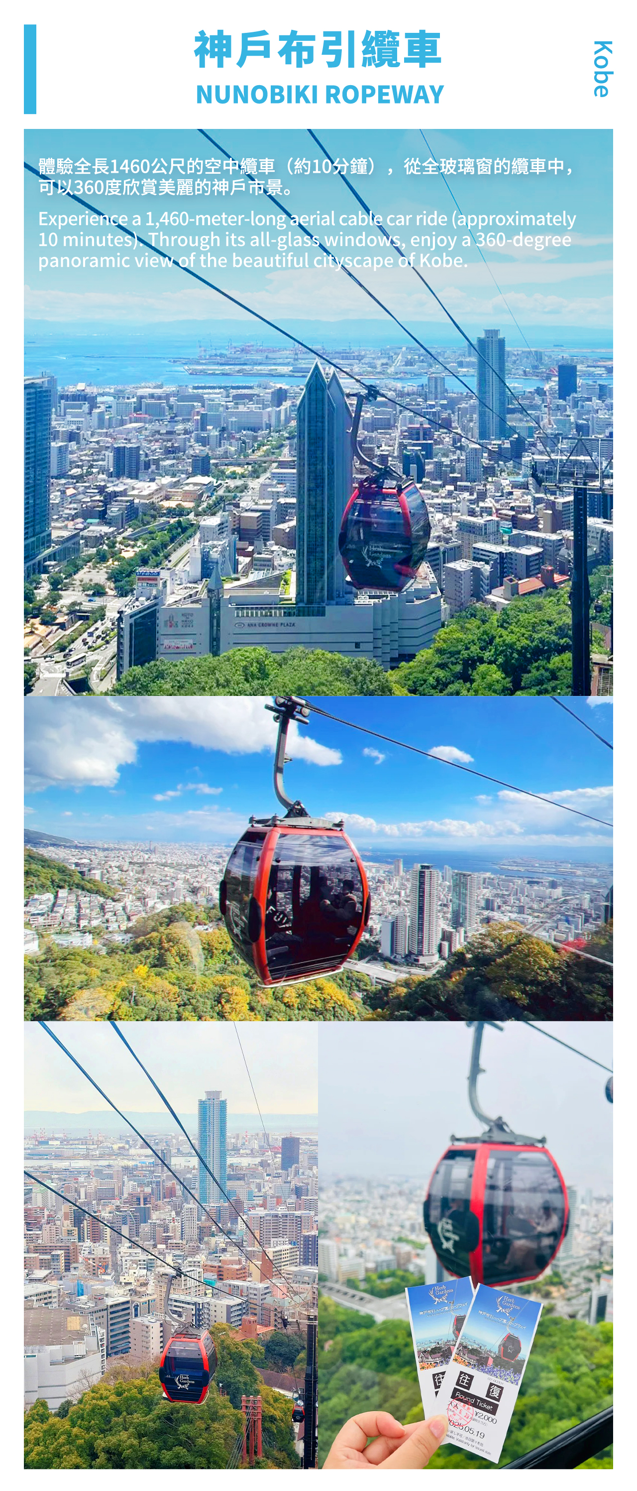 大阪 1小時 直達!神戶浪漫藝術一日遊~ 11:30睡到自然醒 從大阪出發,1個小時左右抵達第一站布引香草園。 ✨【布引香草園:被香氣裹住的山頂浪漫】** 閉館日期:2026年1月6日星期二至2026年1月8日星期四** 神戶布引香草園是日本規模較大的香草園,位於神戶海拔 400 米的山巔。 一定要體驗布引索道!10 分鐘爬升過程中,神戶街景慢慢縮成積木,欣賞神戶市景~推薦徒步下山!沿著山坡分佈著12個主題各異的花園,四季的花卉和草藥色彩斑斕地盛開,走累了還可以在園區內的吊床和香草足浴稍作休憩。 也可以選擇乘坐纜車往返,預留充足時間遊玩。200 種香草花田超治癒,玫瑰園拍人像巨出片,還能摸薄荷、迷迭香;花期具有季節性,具體開放時間以實際情況為準哦~