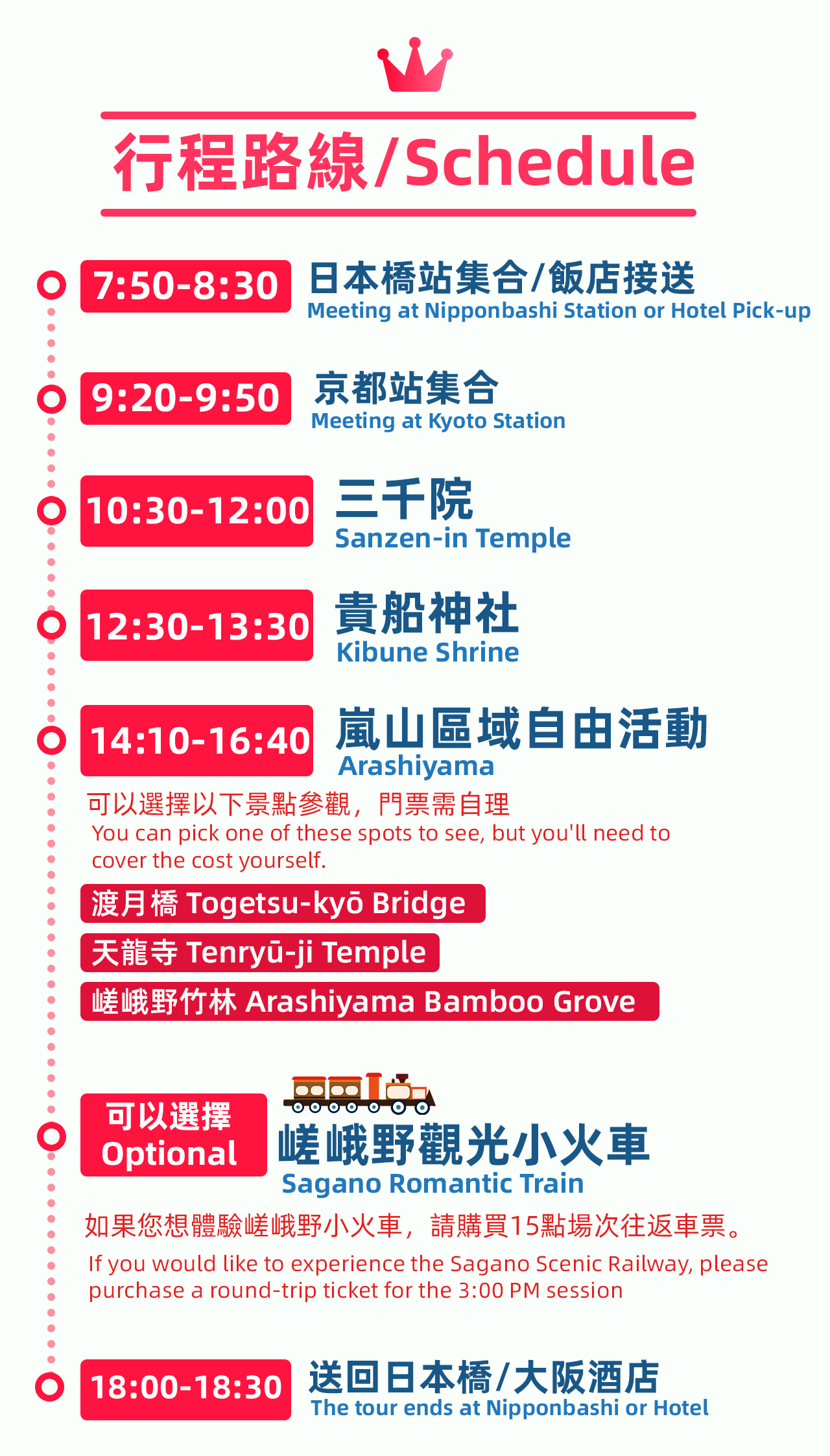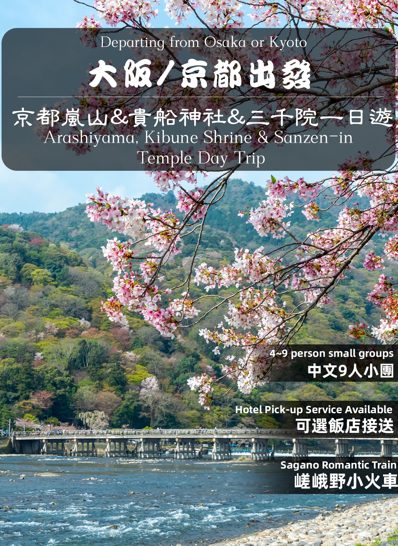 逃離都市喧囂,開啟一場濃縮京都精髓的一日之旅。清晨,我們將從大阪出發,專車直達京都古都。 首先探訪隱匿於山間的**三千院**,在靜謐的日式枯山水庭園中漫步,尋找點綴於青苔間的可愛小地藏,感受片刻禪意。隨後前往神秘的貴船神社,在潺潺溪水旁體驗獨具特色的“水占卜”,於千本燈籠守護的參道上祈求良緣。 午後,漫步於嵐山的如畫風景中。您將穿越沙沙作響的竹林小徑,駐足浪漫的渡月橋,可以乘坐嵯峨野小火車,沿著保津川峽谷,將四季變換的絕美景色盡收眼底。 我們提供9人內精緻小團與中文司導,行程張弛有度,讓您在一次旅程中,輕鬆領略京都的自然、歷史與靈氣。 ※嵯峨野小火車12月30日起停運至次年3月31日。