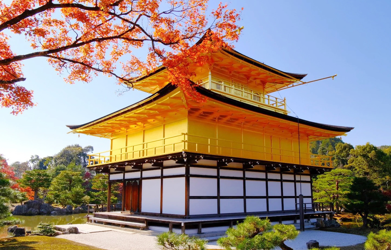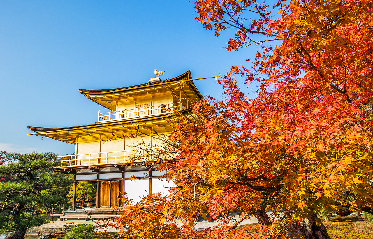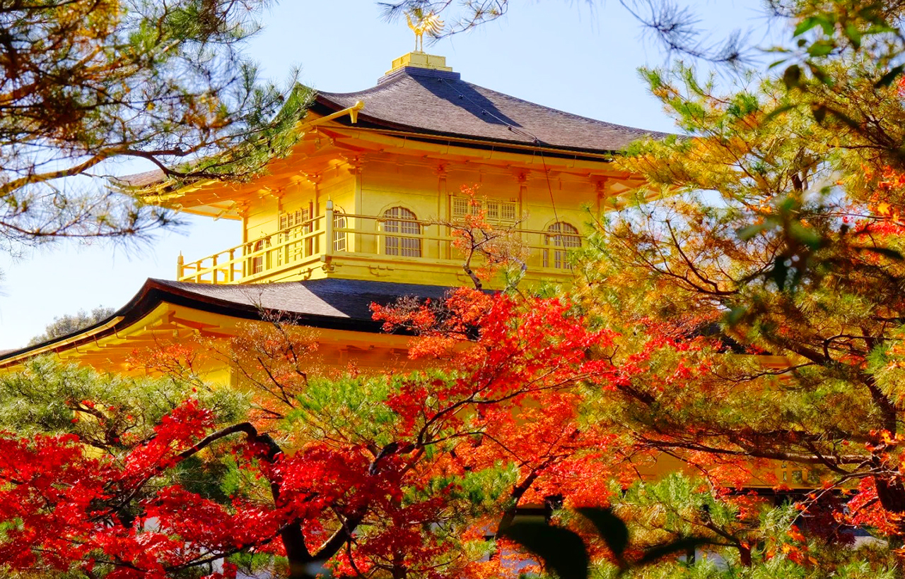 - 秋天寺內的楓葉逐漸變紅,與金閣寺的金色建築相互映襯