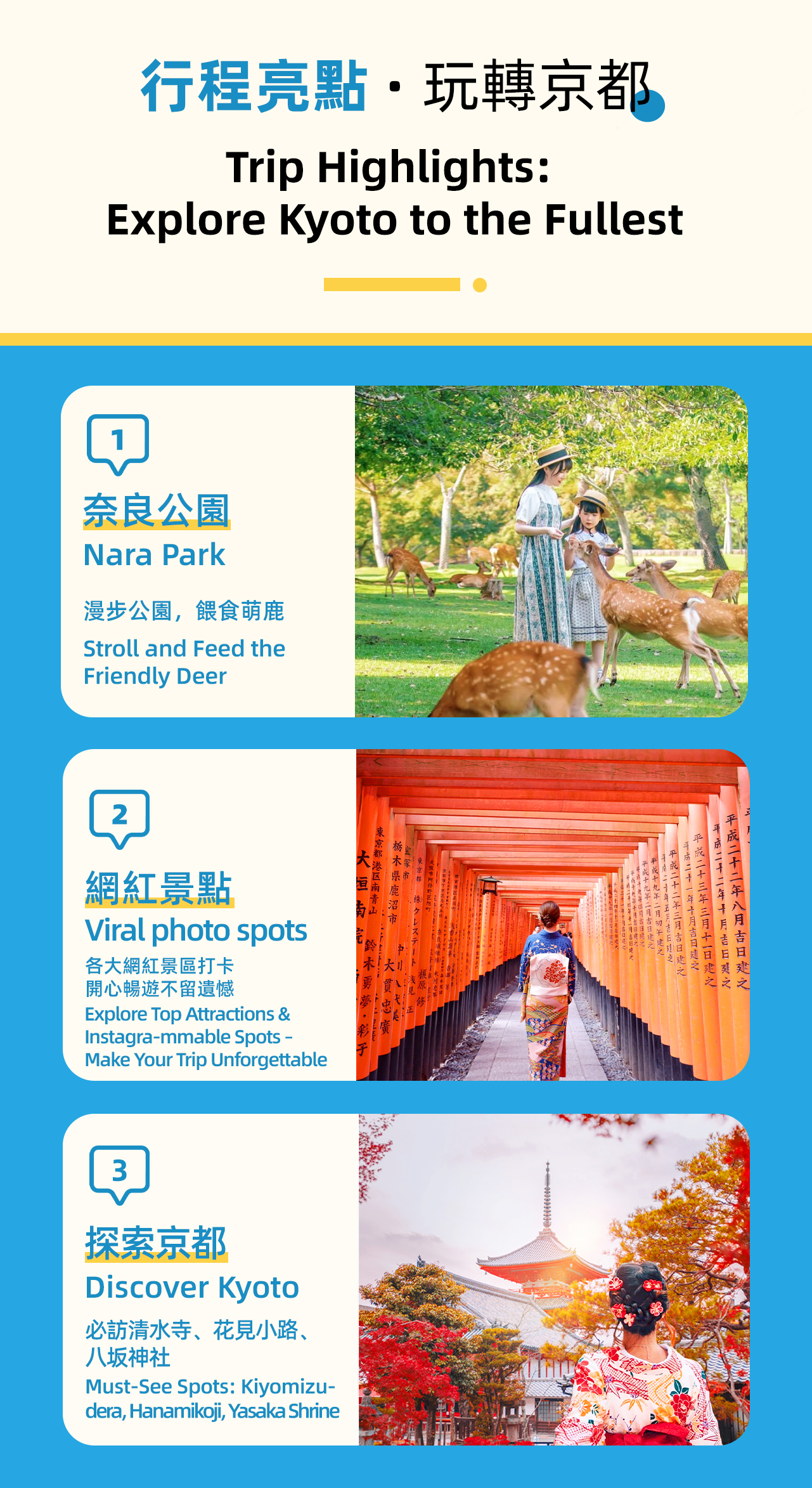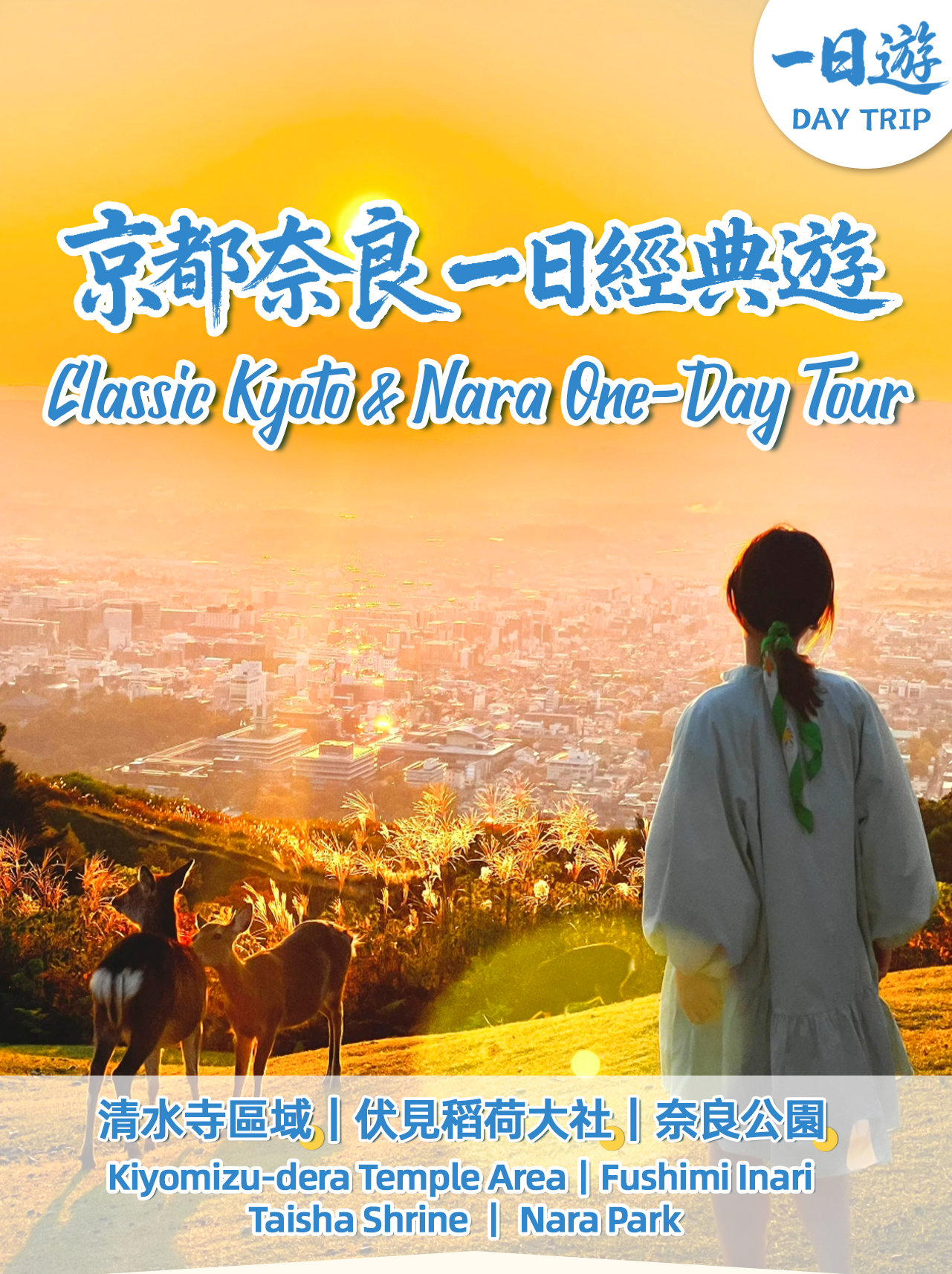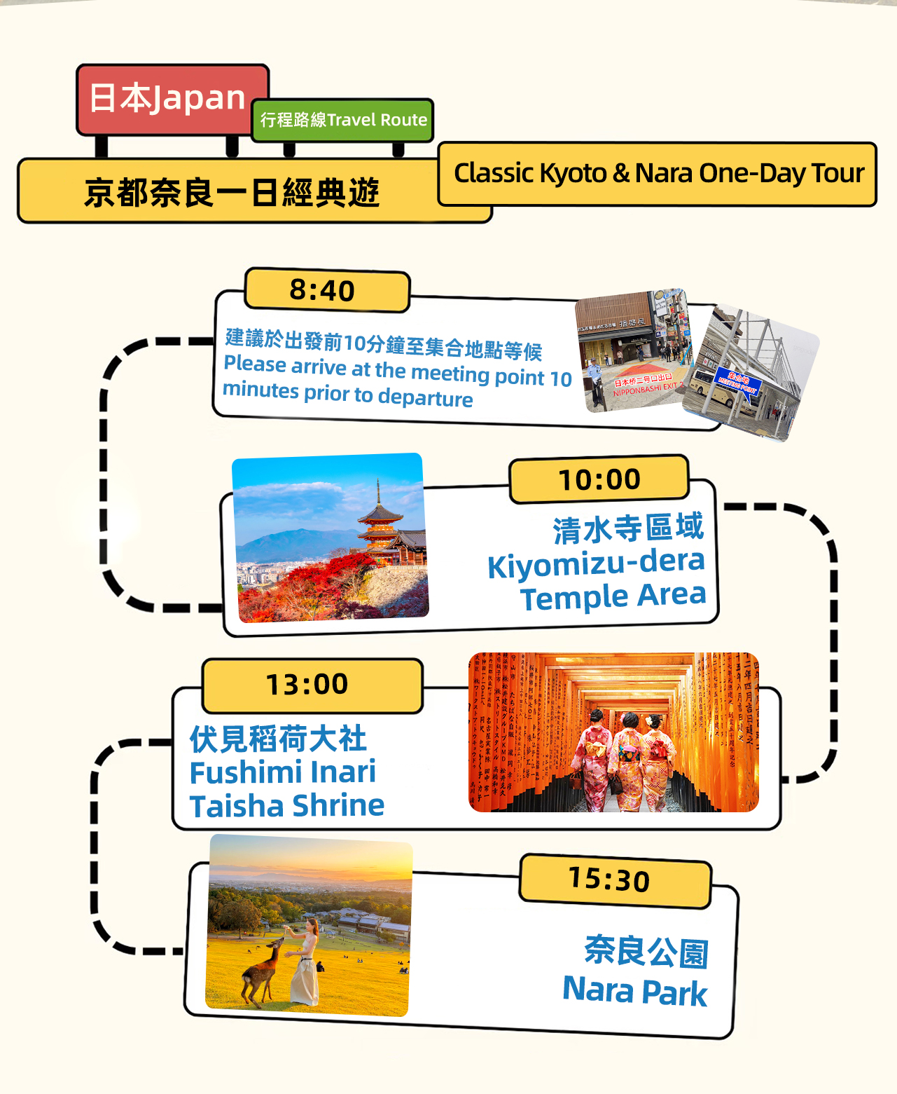 - 第一站:清水寺區域,秋季的清水寺滿山遍野的紅葉,美不勝收。推薦遊玩行程:清水寺-二、三年坂-石塀小路-祗園·花見小路-八坂神社 - 第二站: 伏見稻荷大社以「千本鳥居」聞名,每年都吸引無數日本國內外遊客到訪,更連續3年在全球最大旅遊網站的調查中,獲得「最受外國人歡迎的日本景點」第1位 - 第三站:奈良公園,可同時看到鹿和楓葉的美景公園,公園裡的紅葉在常綠樹的鮮綠對比之下,更顯豔麗 這個景點各具特色,構成了一次京都&奈良世界遺產一日遊活動。無論是自然美景還是文化體驗,都將讓您收穫滿滿的美好回憶。快來加入我們,來一起探索京都奈良的魅力,分享這份快樂吧!