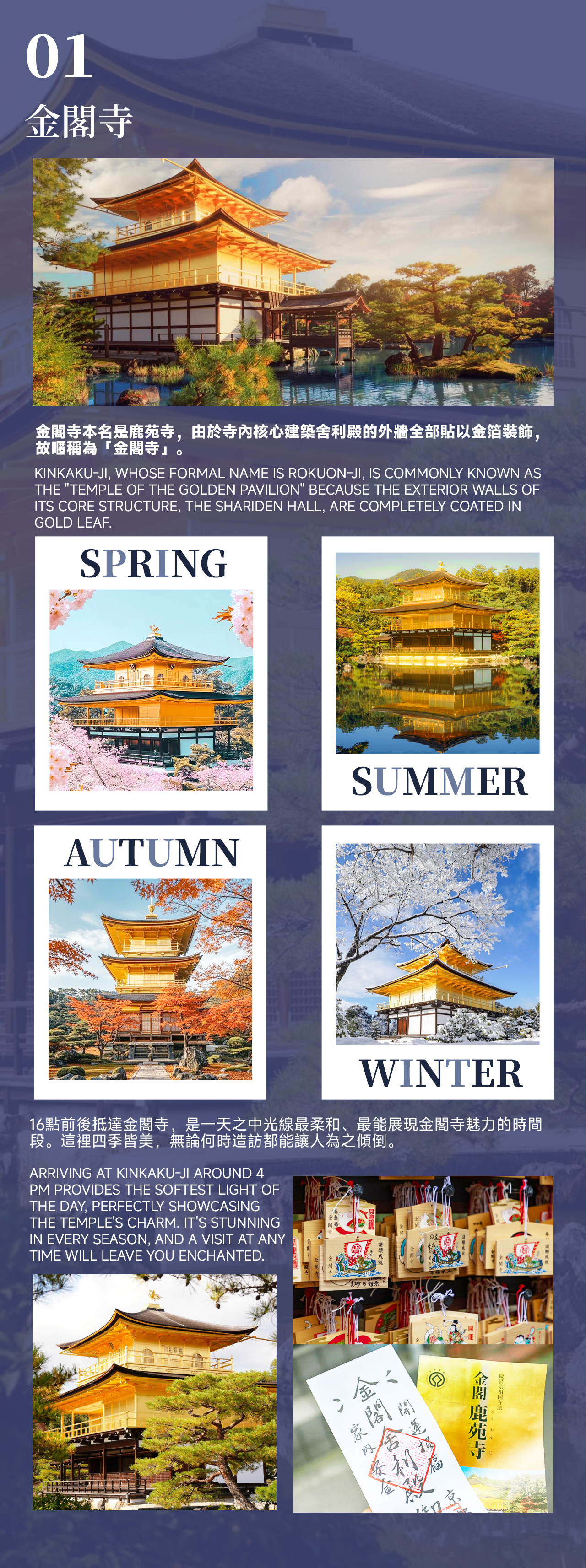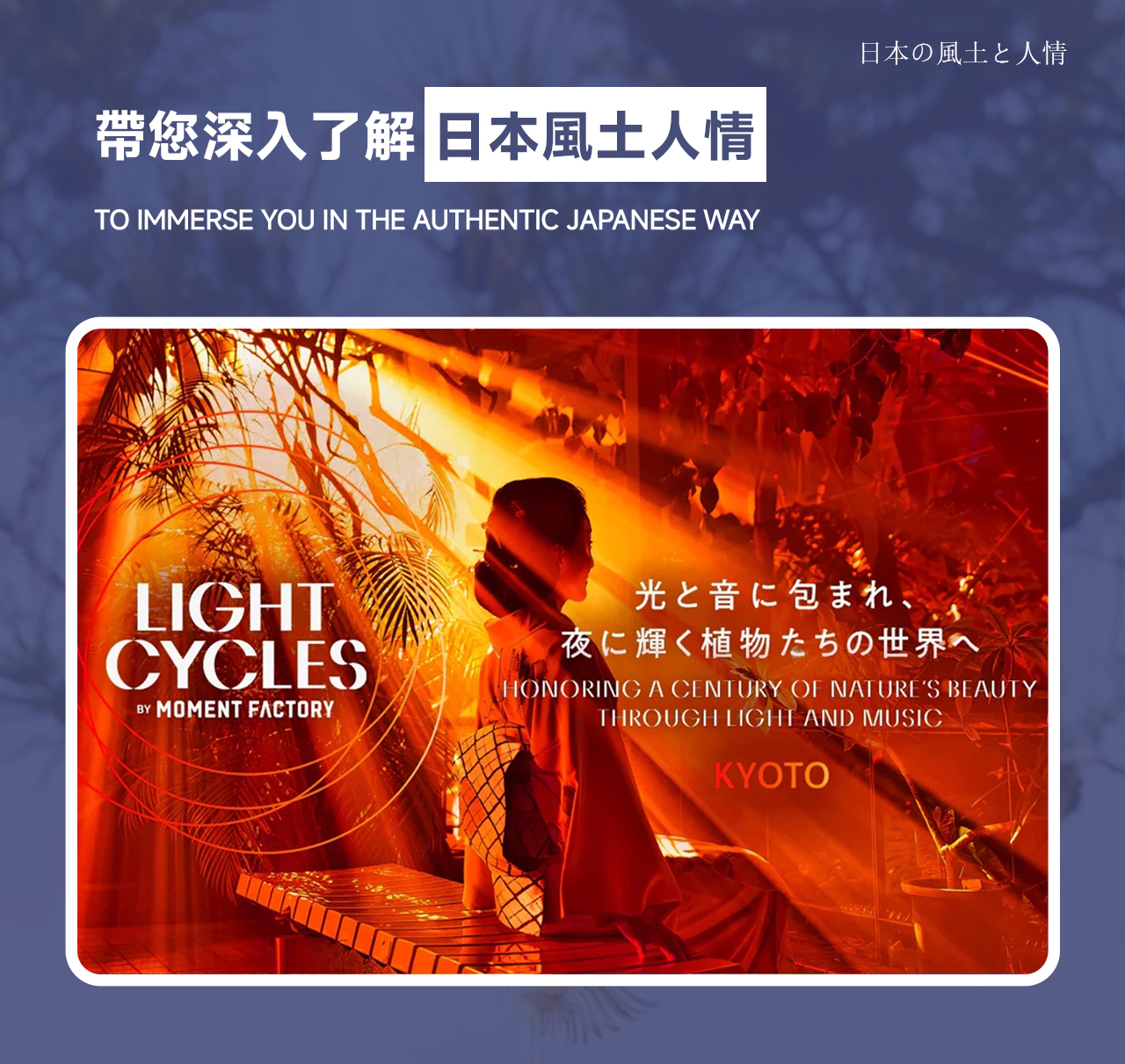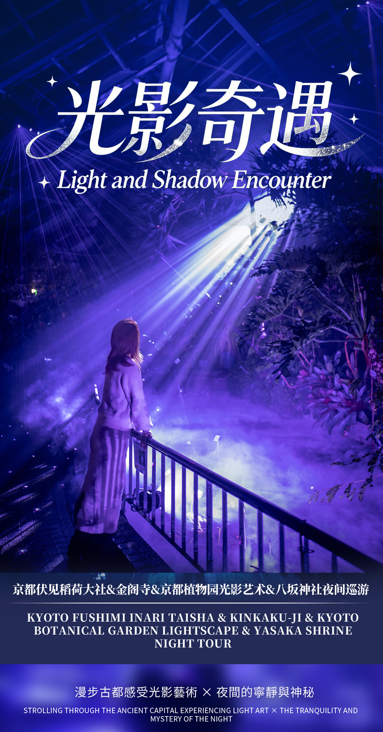 漫步**伏見稻荷千本鳥居**,感受神社古韻與橙色鳥居的壯觀。隨後前往**金閣寺**,夕陽下的金閣寺倒影在鏡湖池中,如畫般寧靜。夜晚,沉浸在京**都府立植物園 LIGHT CYCLES** 的光影藝術中,探索光影與植物的奇妙互動。最後在**八坂神社**欣賞燈籠點亮的夜景,漫步古街,體驗古都獨特夜色與文化魅力。白天經典景點與夜間限定體驗一次收集,拍照打卡,留下難忘回憶。