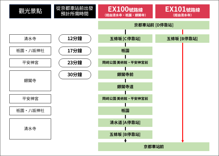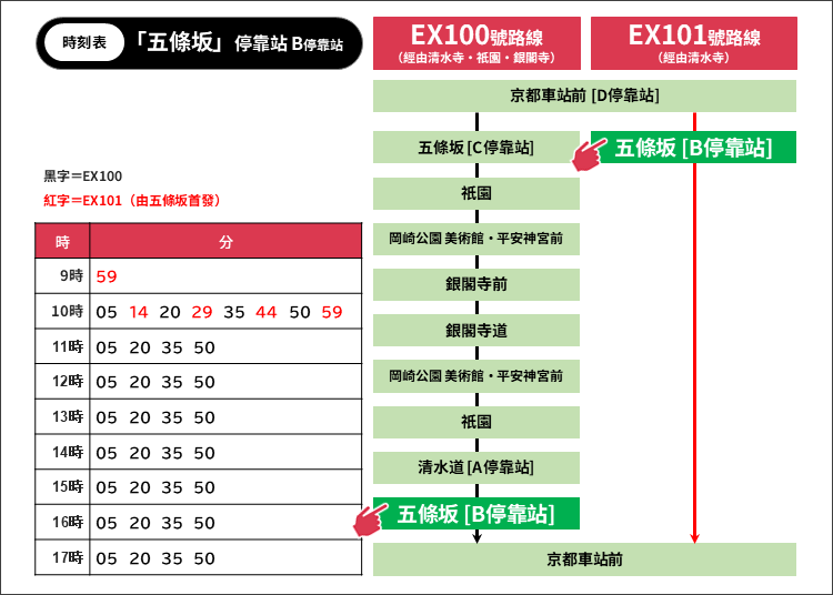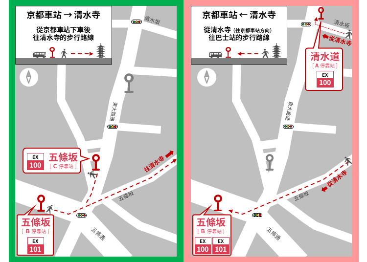 如果要前往清水寺,請在「五條坂」站下車。由於EX100號路線和EX101號路線有些不同,巴士站的位置也不一樣。可參考以下巴士停靠站周邊圖示,下車後找不到路的話,建議使用地圖APP確認位置。