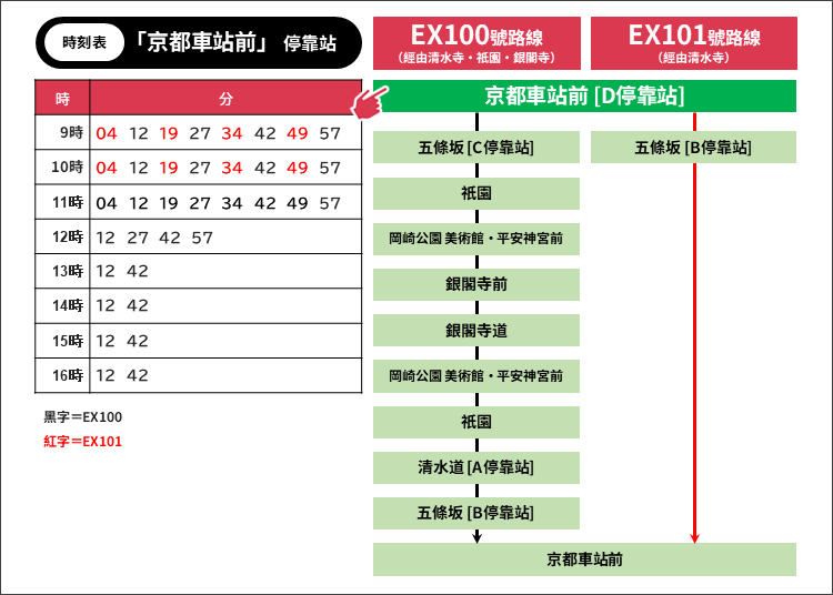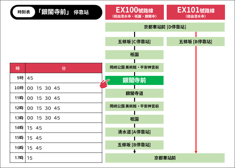 早上時段每間隔7~8分鐘就會有一班車,只要在巴士站等,很快就會有下一班車過來。2025年3月22日現在的時刻表如下。(點此查看最新時刻表請。)EX100號線或EX101號線皆可抵前往清水寺。