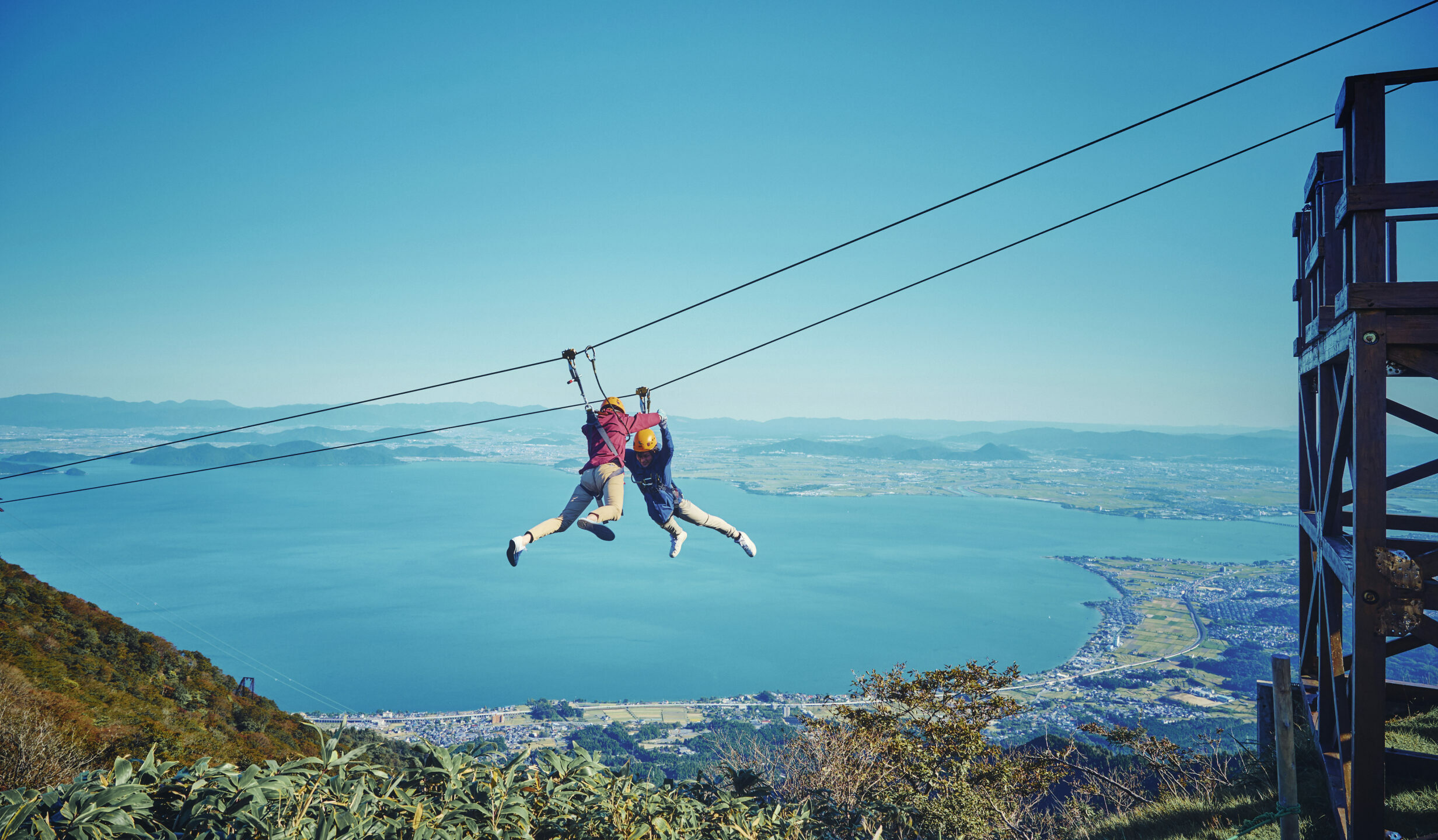 這是琵琶湖谷高空滑索探險的線上預訂頁面。琵琶湖谷位於滋賀縣大津市,是俯瞰琵琶湖的自然度假勝地。從京阪神地區前往非常方便,也是一日遊休閒的好去處。
