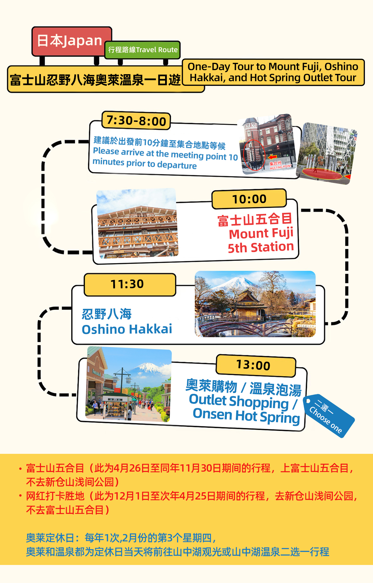 [靜岡] 【富士山遊覽&奧特萊斯購物/溫泉之旅】富士山五合目/新倉山公園&忍野八海&御殿場奧特萊斯/溫泉一日遊(含午餐選項 東京出發)
