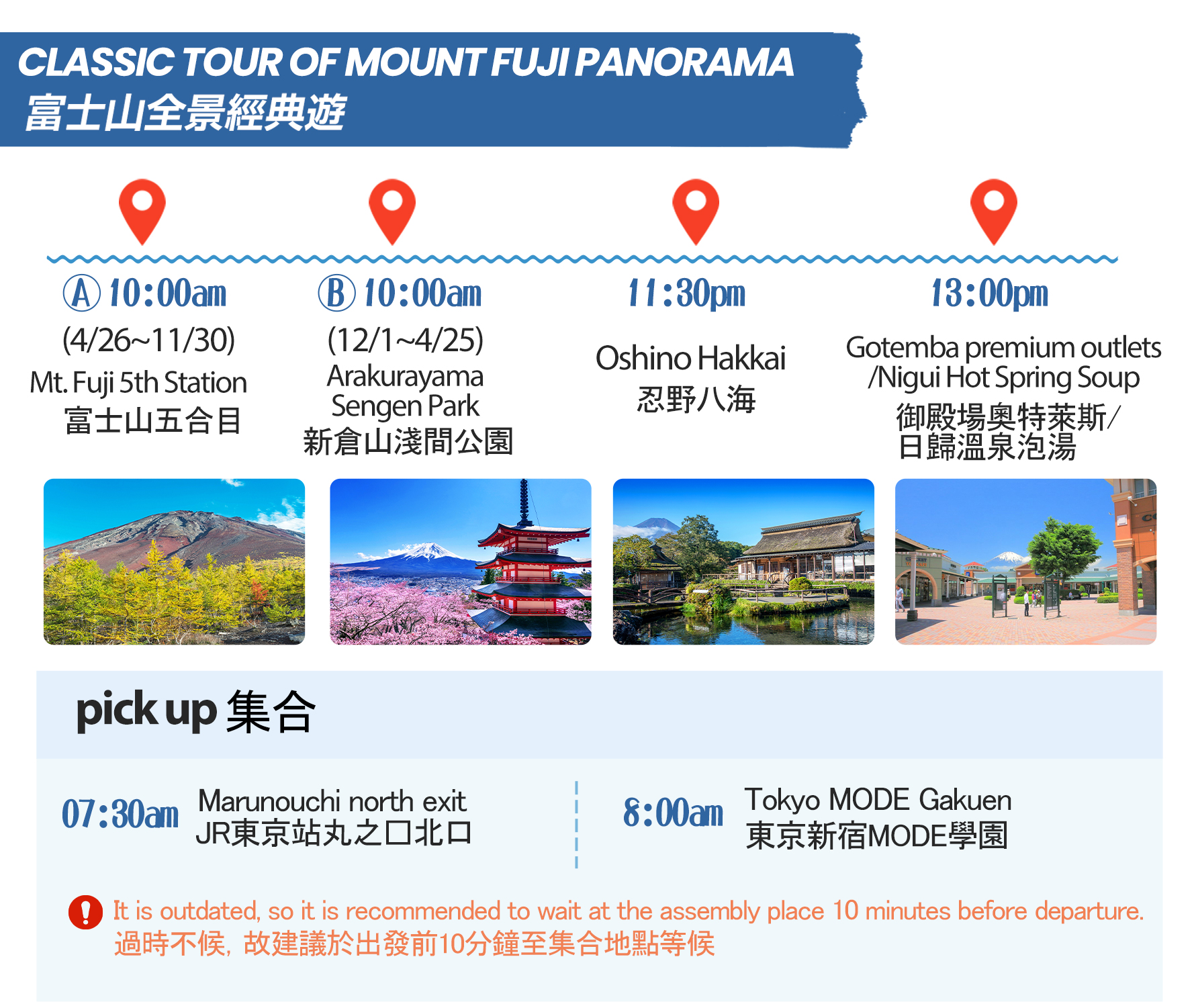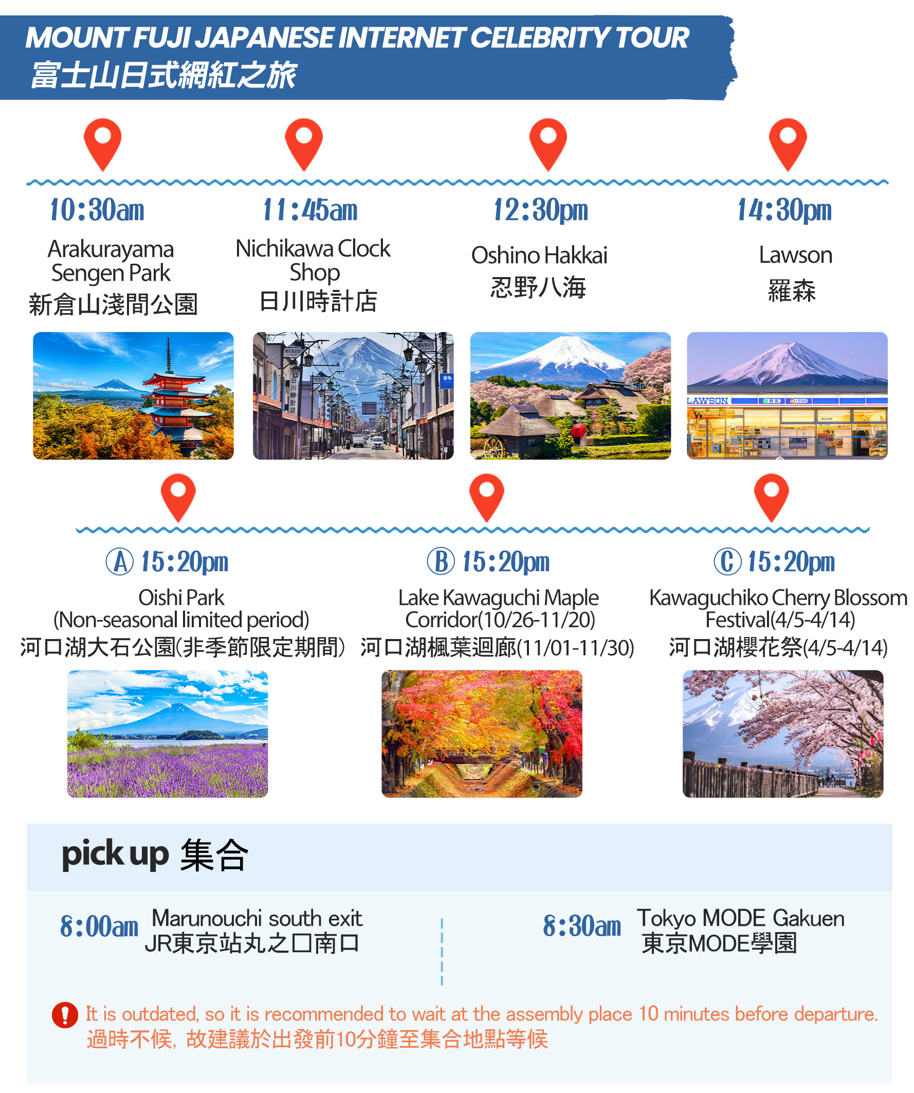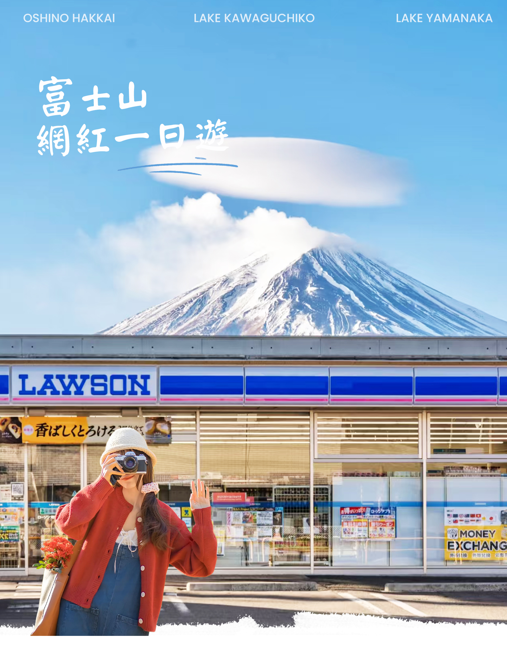 # 精選行程推薦(三選一) ## 【富士山全景遊方案】 涵蓋五合目、新倉山淺間公園、忍野八海等經典地標,同時包含奧萊購物、泡湯放鬆等體驗,一站式打卡富士山周邊精華,是旅行中不可或缺的選擇。 ## 【河口湖抹茶 & 纜車一日遊】 專為河口湖旅行設計:從羅森便利店出發,體驗地道抹茶風味,乘坐纜車