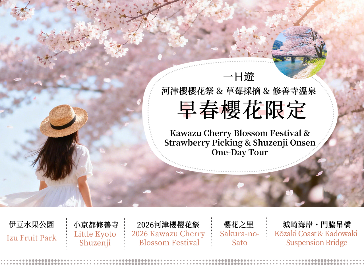 踏上東京近郊最具春天氣息的一日旅程!造訪日本最早盛開的 河津櫻花祭,沿河的粉色櫻花步道讓你一次拍個夠。接著前往草莓園體驗 現採現吃的草莓採摘,甜度爆表、鮮美多汁。下午漫步具有 1200 年曆史的 修善寺溫泉街,體驗寧靜古樸的溫泉小鎮。3/9 起加贈前往城崎海岸與門脅吊橋,一覽壯麗斷崖與藍色大海的絕景,是早春限定的完美組合!