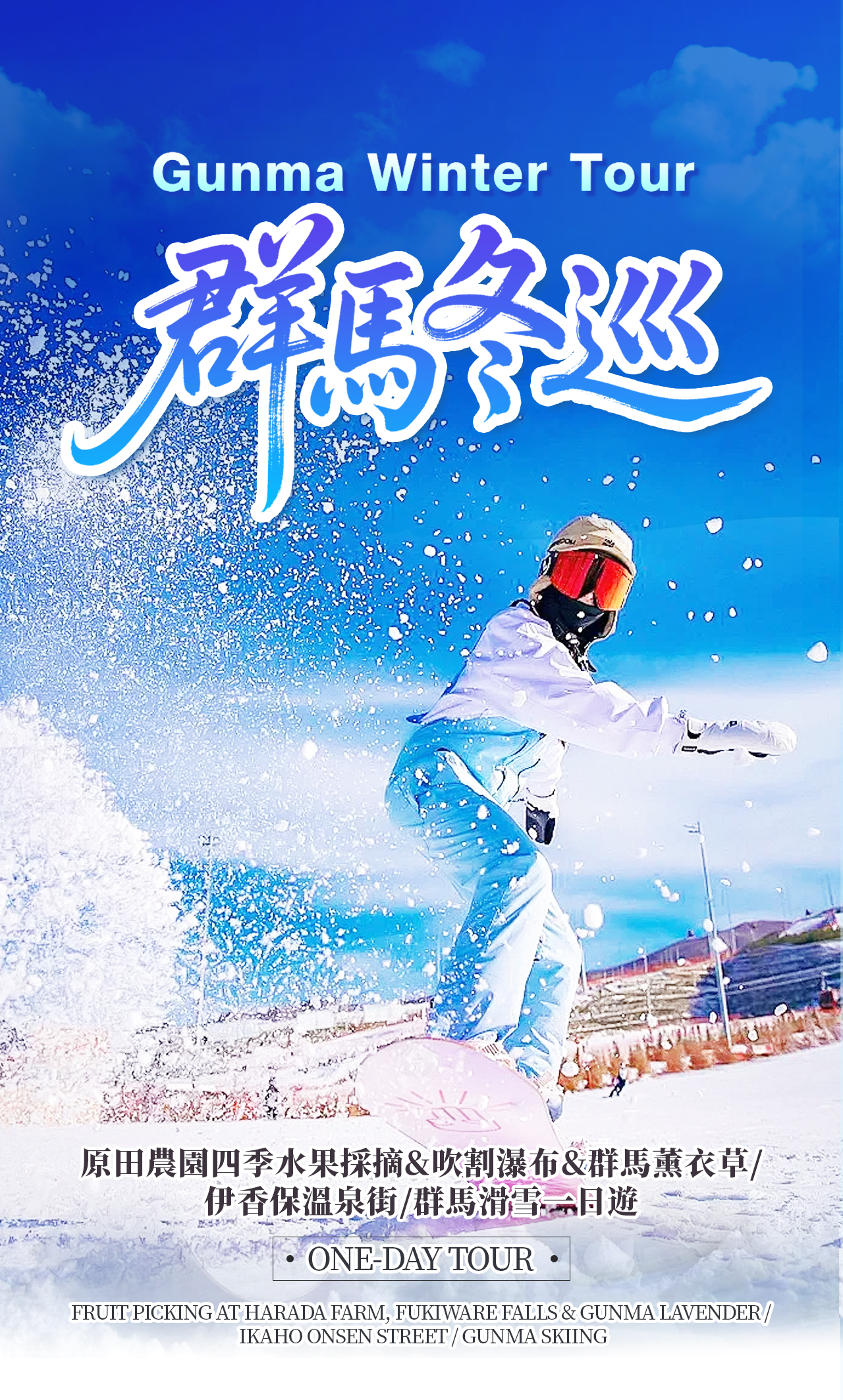 ## 從東京出發,開啟群馬自然與美食的一日小旅行!行程安排三大亮點:既有全年適合的自然奇觀與水果採摘,也搭配隨季節更替的限定體驗,讓親子家庭與年輕旅客都能玩得盡興。 **第一站|吹割瀑布(瀑布封鎖期間前往川越一番街 )** 被譽為“東洋尼亞加拉”,秋季紅葉映襯飛瀑如畫,冬季可見冰雪瀑布的獨特風景,夏季更是避暑勝地。由於12月4日吹割瀑布冬季封鎖,只能到六角堂遠觀,且階梯較滑存在風險,**12月7日起~2026年4月1日期間將前往:川越一番街** **第二站|原田農園水果採摘** 親手採摘當季水果,夏有櫻桃,秋有蘋果,冬有草莓。孩子們最愛,大人們也能享受最新鮮的甜蜜滋味。 **第三站|季節限定體驗** **4月6日~6月30日,9月1日~12月19日**|伊香保溫泉石段街:紅葉環繞的石階小鎮,邊走邊嘗地道美食,最後泡湯暖身。 **7月1日-8月31日**|玉原薰衣草公園:超過 5 萬株薰衣草鋪滿山坡,宛如富良野般的紫色花海,漫步其間感受夏日花香,並可自費搭乘花田纜車俯瞰壯麗景色。 **12月20日–4月05日**|玉原滑雪公園:盡情玩雪、打雪仗、堆雪人,或體驗滑雪初學樂趣,冬季歡樂無限。