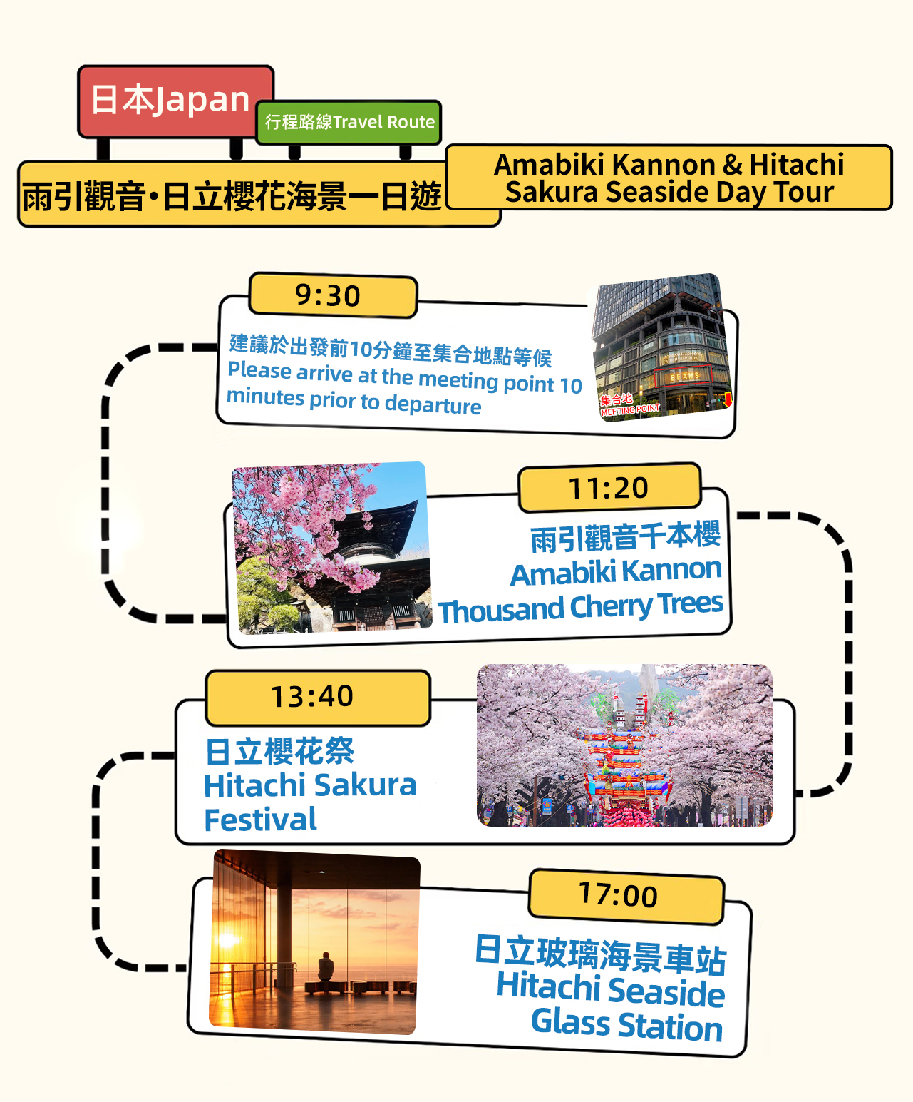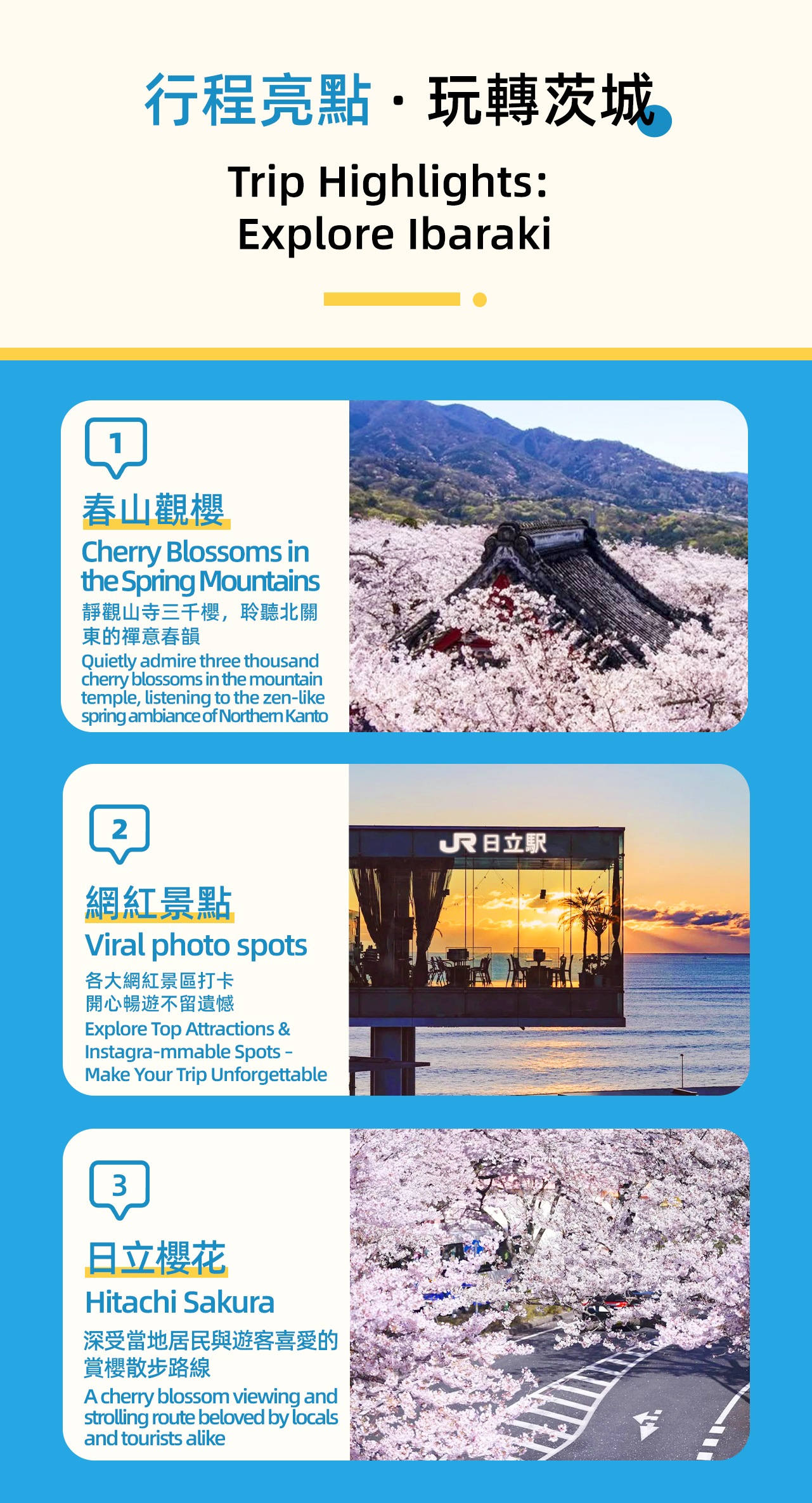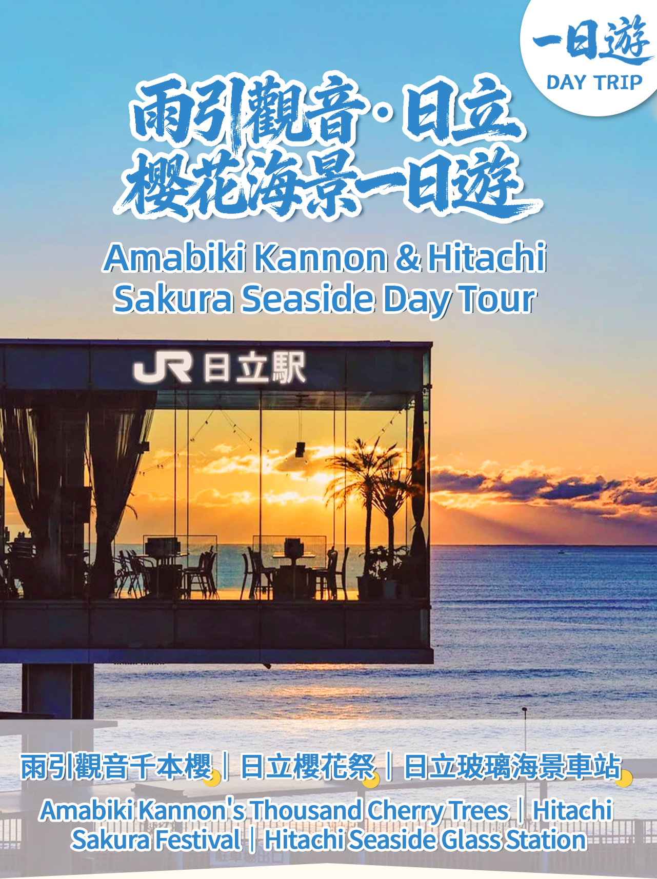 這是一場融合了歷史古韻、都市花海與現代建築美學的茨城一日遊。行程從東京出發,交通便利,讓你在一天之內領略到日本春季截然不同的三種風情。 以下是本次活動的精彩看點介紹: 上午:古寺探幽 · 雨引觀音千本櫻 隱世花寺:探訪位於雨引山半山腰的雨引山樂法寺(通稱:雨引觀音)。這是一座擁有1400多年曆史的古剎,也是關東地區著名的安產祈福靈場。寺內及周邊種植了約3000株櫻花,包括河津櫻、染井吉野櫻等。得益於品種交替盛開,這裡的賞櫻期可長達一個月(通常自3月中旬起),不錯過春日的每一抹粉嫩。 下午:都市狂歡 · 日立櫻花祭 櫻花百選:轉場至日立市,漫步於入選“日本櫻花百選”的平和通。這裡長達1公里的道路兩側櫻花成排,形成夢幻的“櫻花隧道”,是當地最具代表性的春日景觀。 限定文化盛宴:若行程恰逢4月5日或6日,你將有幸目睹非物質文化遺產——“日立風流物”的精彩演出。高達15米的豪華山車與五層機關人偶戲(如《忠臣藏》),展現了百年傳承的精湛技藝。 地道風味:在祭典期間,你還可以自由品嚐茨城縣的當地特色美食,感受春日祭典的熱鬧菸火氣。 傍晚:建築奇遇 · 日立玻璃海景車站 最美車站:以榮獲國際大獎的日立站作為旅程的終點。這座由建築大師妹島和世設計的車站,宛如一個漂浮在太平洋上的“玻璃盒子”,置身於通透的站內,可以零距離欣賞遼闊的太平洋。夕陽西下時,海天被染成溫柔的橙粉色,景色浪漫至極。 總結來說,這是一次從古老山寺到繁華街道,再到現代建築的時空穿梭之旅,既能賞花祈福,又能感受地道祭典與頂級設計之美。