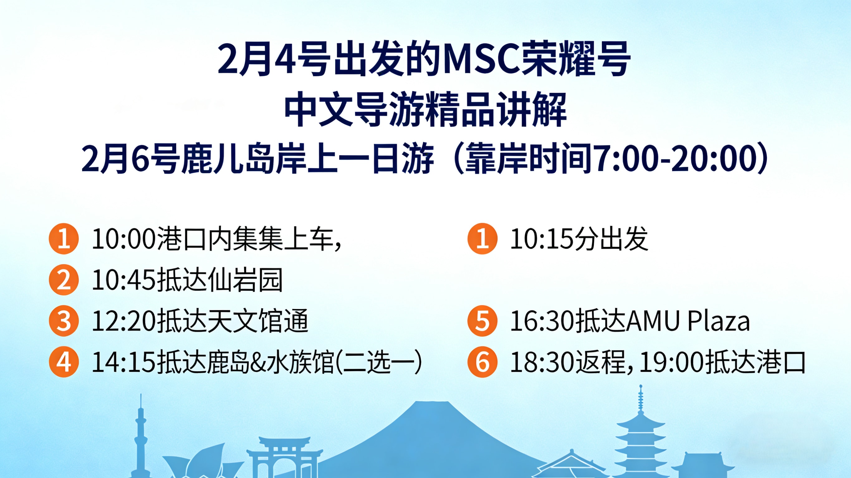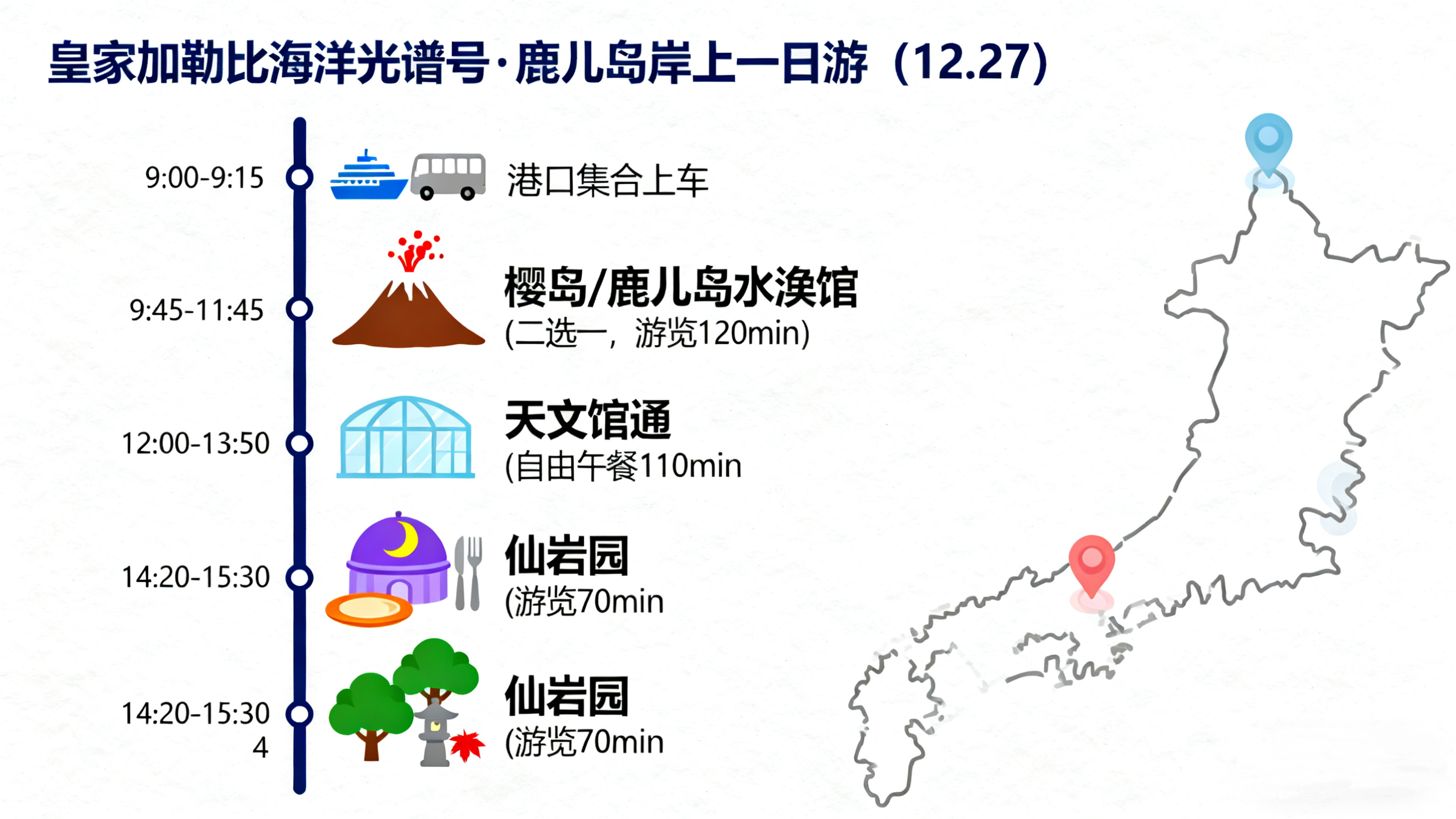 鹿兒島岸上一日遊(靠岸時間根據每趟航次具體靠岸時間確定) 1、港口內集合上車, 2、抵達仙岩園,瀏覽70min 仙岩園的園林設計,借景櫻島火山,以櫻島火山為背景,錦江灣為池,將大自然的磅礴與日式庭院的精緻完美融合!還有貓貓神社!是鹿兒島必去景點! 3、抵達天文館通,自由午餐130min 聚集了高品質鹿兒島黑和牛燒肉、壽司、刺身、拉麵等日式正宗美食店鋪,,餐後還可以開始逛街,駿河屋、山形屋百貨、 堂吉訶德、大型超市、各種連鎖品牌店鋪應有盡有; 4、抵達櫻島& 鹿兒島水族館(二選一)遊覽120min 日本乃至全球最活躍的火山之一,幾乎每天都在噴發(主要為小規模噴菸、噴灰),較大規模噴發也時有發生。 無需換乘其他車輛,直接開啟環島之旅:停靠湯之平展望所&足浴&遊客中心 5、返程,抵達港口