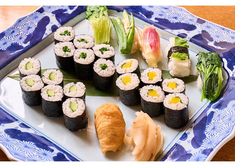 那就是職人以秋葵、茗荷(蘘荷)、山藥、蘿蔔嬰等當地新鮮蔬菜為主角,精心製作的握壽司與壽司卷。水嫩的蔬菜與多年淬鍊的傳統手藝互相結合的壽司,呈現出色彩繽紛、令人驚喜的美味。非常推薦與喜歡吃魚的旅伴一起,在吧檯或包廂內細細品嘗喔。