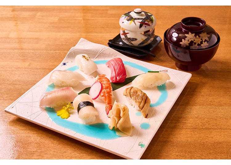 上等握壽司(3,700日圓)。使用來自日本各地的新鮮食材。餐點另附茶碗蒸與清湯。