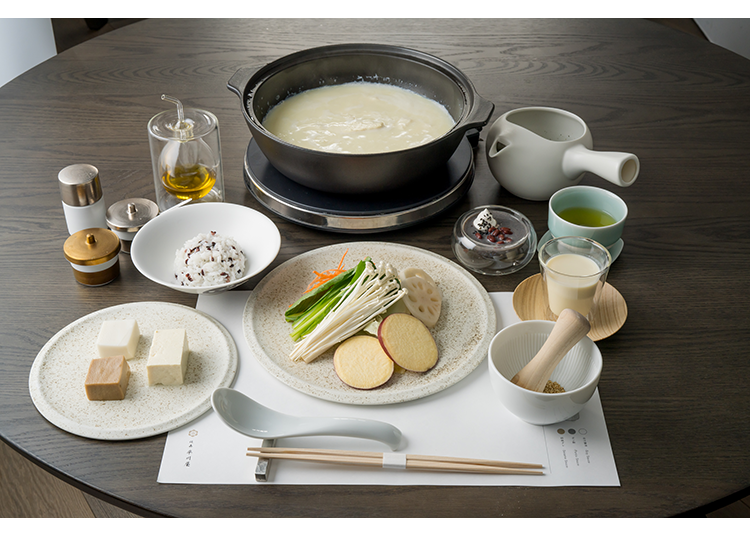 溫泉湯豆腐御膳 華(4,000日圓)。湯豆腐御膳搭配佐賀縣產的有田雞與金星豬,肉的鮮甜與豆腐的濃郁滑順完美調和。