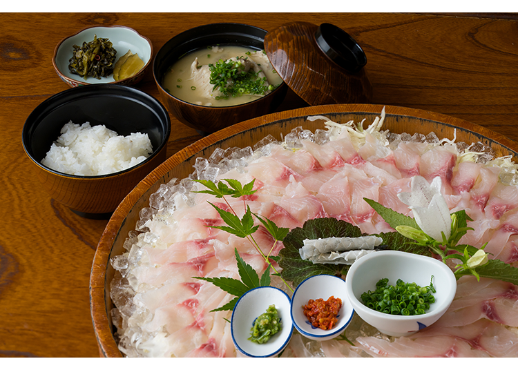 鯉魚冰鎮鯉魚片定食(附:冰鎮鯉魚片、味噌燉鯉魚湯、漬物)(2~3人份/4,000日圓)。將鯉魚以流水與冰水冰鎮後,切成薄片,搭配帶有山椒香氣的特製醋味噌,呈現出唯有清流之鄉才能品嘗到的清爽口感。