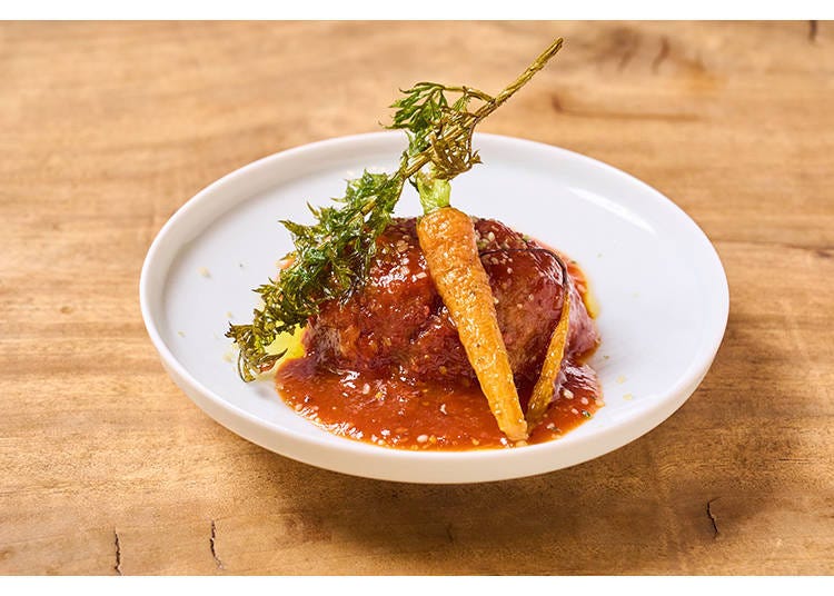 晚餐時段有供應使用肉類或魚類的料理(3,700日圓)。照片是將豆腐混合牛、豬絞肉製成的漢堡排。