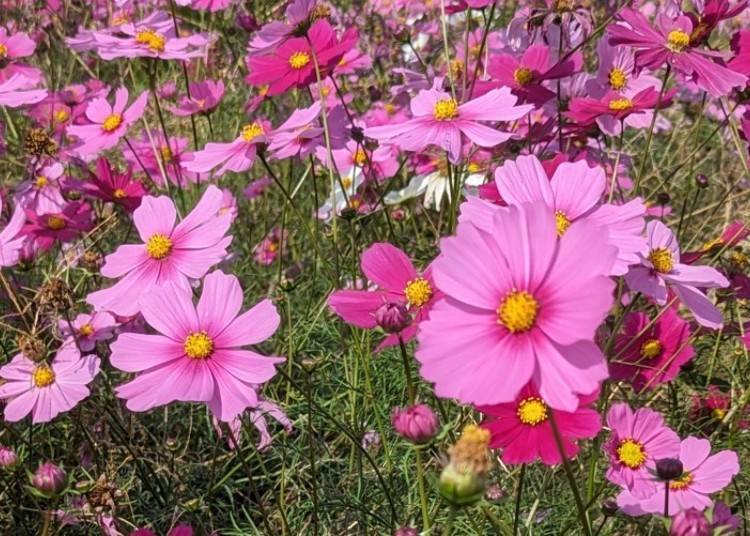 大波斯菊花田橫跨見晴之丘之下和廣闊的草原花園,2、3百萬株大波斯菊競相綻放,構成了日本最具代表性的秋景之一。紅色、白色和粉紅色的大波斯菊與火紅的藜科植物形成了絕美的對比,而栽培品種的多樣性和色彩的絢麗也為這片美景錦上添花。