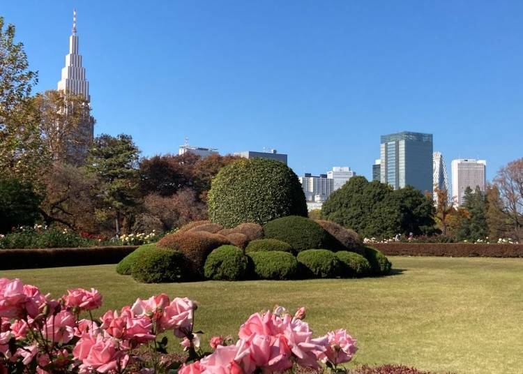 2. 新宿御苑:在新宿摩天大樓的襯托下,欣賞秋季玫瑰和紅花的壯麗景色