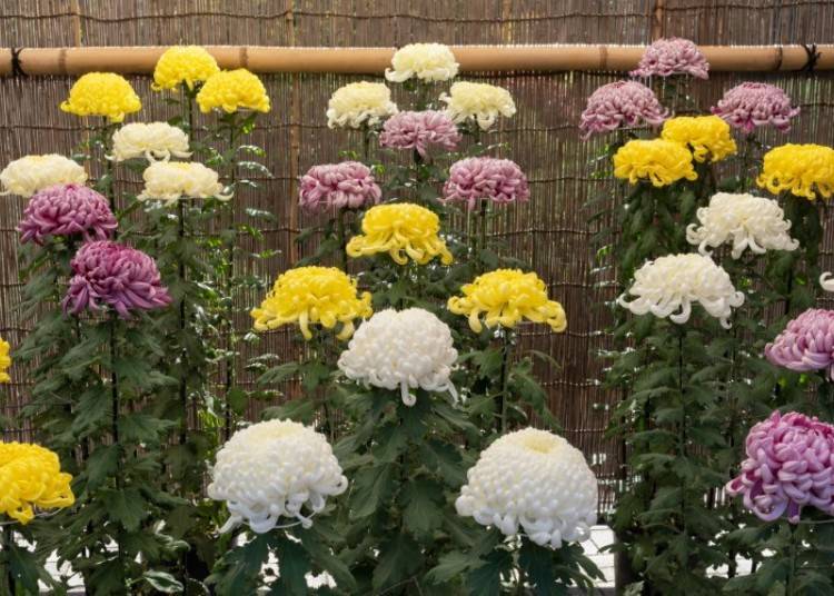 遊客還可以欣賞菊花的季節性美景,這些菊花以日本傳統的懸崖盆栽(瀑布)和盆景佈置等風格呈現,彰顯了園藝大師的技能。