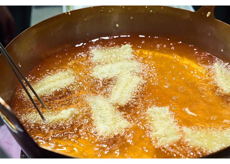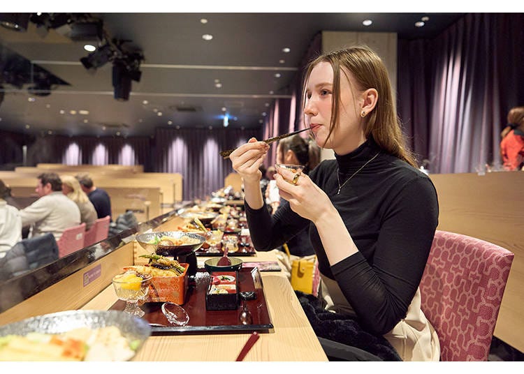 在等待開演的期間,新鮮現做的日本料理會依序上桌。會場內的廚房採用玻璃隔間設計,能近距離欣賞烹調過程也是一大看點。很少有機會能親眼看到天婦羅在銅鍋中油炸的過程,讓人忍不由自主地被吸引目光。