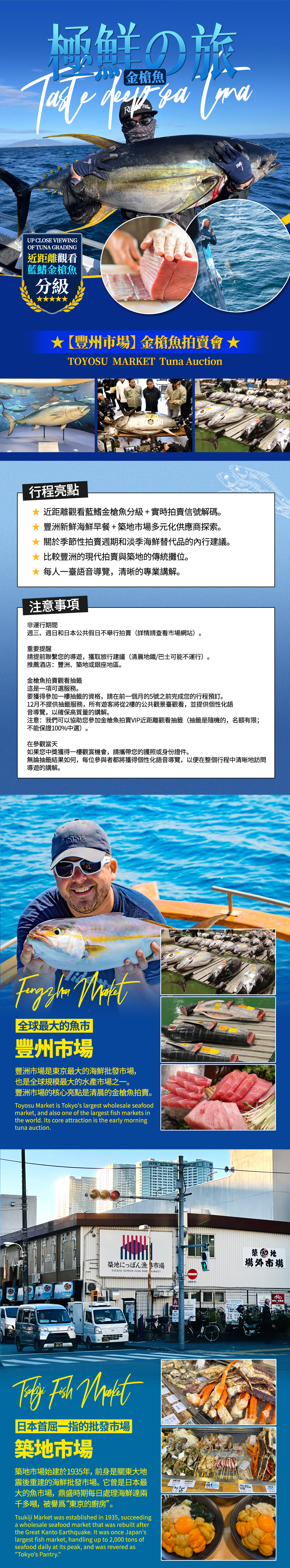05:00–06:30 金槍魚拍賣會沉浸式核心體驗 深入體驗拍賣的精彩!如果您中到一樓的 VIP 彩票,就可以近距離觀看藍鰭金槍魚的分級過程。如果沒有,您將從 2 樓的公共觀景臺觀看。每位參與者都將獲得個性化的語音導覽——您的導覽將實時解碼現場拍賣手勢。即使在樓上,您也能清楚地聽到有關金槍魚的知識和交易細節,親身體驗高風險海鮮交易的刺激! 沉浸在金槍魚拍賣的刺激之中 飯店接載服務:凌晨 4:20 至 5:00(含) 會面地點:Lawson Toyosu Market Senkyaku Banrai 05:00–06:30 金槍魚拍賣會沉浸式核心體驗 深入體驗拍賣的精彩!如果您中到一樓的 VIP 彩票,就可以近距離觀看藍鰭金槍魚的分級過程。如果沒有,您將從 2 樓的公共觀景臺觀看。每位參與者都將獲得個性化的語音導覽——您的導覽將實時解碼現場拍賣手勢。即使在樓上,您也能清楚地聽到有關金槍魚的知識和交易細節,親身體驗高風險海鮮交易的刺激! 06:30–07:15 市場新鮮海鮮早餐(45分鐘) 在豐洲市場享用豐盛的早餐,每日菜單都會展示當天最新鮮的海產。想象一下,熱氣騰騰的海鮮拉麵裡有剛剛捕獲的飽滿蝦子和嫩滑章魚,或者入口即化的壽司,每一口都能感受到東京豐富的海鮮文化。 07:15–07:45 探索市場精髓 跟隨專業導遊深入參觀豐洲市場。觀察現場加工新鮮市場食材的過程,瞭解複雜的海鮮供應鏈。 07:45–08:00 築地市場接送服務(含交通費) 我們為您安排了從豐洲市場到築地市場的交通服務。您的導遊將協助您,確保您順利從一個市場前往另一個市場。 08:00–08:30 築地市場漫步 探索築地市場熱鬧非凡的攤位,這裡的小商店充滿魅力,出售新鮮的帶回家的海鮮、獨特的廚具等。沉浸在熱鬧的氛圍中,觀看當地人討價還價,併購買紀念品。