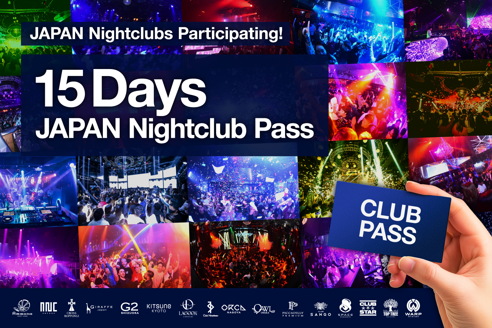 手持一張通行證,即可探索日本的精彩夜生活! 這張 15 天日本夜店通行證,讓您免費暢遊日本各地 [16 家頂級夜店](https://drive.google.com/file/d/1BU4t3x76ssCs4-ohcwp1u4_1FGZfyLct/view?usp=sharing),包含東京、大阪、京都、名古屋、神戶、廣島、沖繩等城市。 **・此通行證可能不適用於特定場館的特殊活動日或國定假日,請務必提前與場館確認。 ・每間場館每日限使用一次。 ・您可在不同日期再次造訪同一間場館。 ・出示通行證即可免費入場。 ・每間場館皆須現場購買一杯飲品。 ・場館可能因人數限制、特殊活動、服裝規定或安全考量而拒絕入場。 ・請務必攜帶您的護照。**
